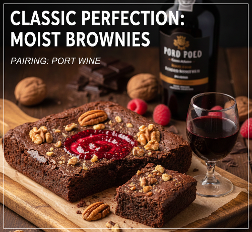 ★ 페어링 와인: 브라우니의 묵직한 단맛과 진한 카카오 향에는 포트 와인(Port Wine) 또는 다크 초콜릿 노트가 강한 레드 와인이 잘 어울립니다. 특히 루비 포트(Ruby Port)의 풍부한 과실향은 브라우니의 달콤쌉쌀한 맛과 환상적인 조화를 이룹니다.